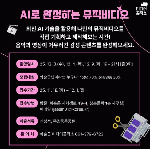 [¹Ìµð¾îÀü³² Á¦°¥´ëÁ¾ ±âÀÚ]ȼø±ºÀº ¿À´Â 12¿ù 3ÀϺÎÅÍ È¼ø±º¹ÎÀ» ´ë»óÀ¸·Î ȼø±º û³â¼¾ÅÍ(ûÃáµé¶ô) ¹Ìµð¾î°øÀÛ¼Ò¿¡¼ ¡®AI·Î ¿Ï¼ºÇÏ´Â ¹ÂÁ÷ºñµð¿À ¿µ»ó Á¦ÀÛÇϱ⡯ ±³À°À» ÁøÇàÇÑ´Ù°í ¹àÇû´Ù. À̹ø ±³À°Àº Sora2¿Í Vrew¸¦ Ȱ¿ëÇØ ¡¦