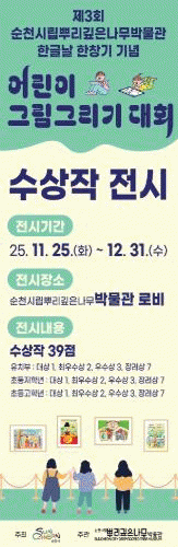 [¹Ìµð¾îÀü³² ÀÓ¼º¿Ï ±âÀÚ]¼øÃµ½Ã´Â ¿À´Â 11¿ù 25ÀϺÎÅÍ 12¿ù 31ÀϱîÁö ¼øÃµ½Ã¸³»Ñ¸®±íÀº³ª¹«¹Ú¹°°ü »ó¼³Àü½Ã½Ç ·Îºñ¿¡¼ 'Á¦3ȸ ¼øÃµ½Ã¸³»Ñ¸®±íÀº³ª¹«¹Ú¹°°ü Çѱ۳¯ ÇÑâ±â ±â³ä ¾î¸°ÀÌ ±×¸²±×¸®±â ´ëȸ ¼ö»óÀÛ Àü½Ãȸ'¸¦ °³ÃÖÇÑ´Ù. À̹ø¡¦