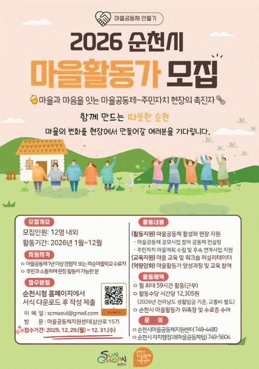 [¹Ìµð¾îÀü³² ÀÓ¼º¿Ï ±âÀÚ]¼øÃµ½Ã´Â ¸¶À»°øµ¿Ã¼ ¸¸µé±â °ø¸ð»ç¾÷ÀÇ ¿øÈ°ÇÑ ÃßÁø°ú ÁÖ¹ÎÀÚÄ¡¡¤¸¶À»°øµ¿Ã¼ Ȱ¼ºÈ µî µû¶æÇÑ ¼øÃµÀ» ÇÔ²² ¸¸µé¾î°¥ 2026³â ¸¶À»È°µ¿°¡ 12¸íÀ» ¸ðÁýÇÑ´Ù°í ¹àÇû´Ù. À̹ø¿¡ ¸ðÁýÇÏ´Â ¸¶À»È°µ¿°¡´Â ¸¶À»È°µ¿°¡ ¡¦