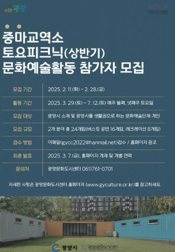 [¹Ìµð¾îÀü³² ÀÓ¼º¿Ï ±âÀÚ]±¤¾ç¹®Èµµ½Ã¼¾ÅͰ¡ ¡®Á߸¶±³¿ª¼Ò Åä¿äÇÇÅ©´Ð¡¯ ¹®È¿¹¼úȰµ¿ Âü°¡ÀÚ °ø¸ð¸¦ ½ÃÀÛÇϸç 2025³â ±¤¾ç ¹®È±³¿ª¼ÒÀÇ ÈûÂù Ãâ¹ßÀ» ¾Ë·È´Ù. ¡®Åä¿äÇÇÅ©´Ð¡¯Àº Á߸¶»ýŰø¿ø ³» 3µ¿ÀÇ ÄÁÅ×À̳ʷΠ±¸¼ºµÈ Á߸¶±³¿ª¼Ò¸¦¡¦
