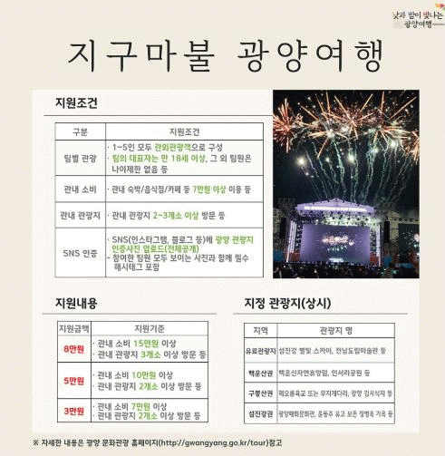 [¹Ìµð¾îÀü³² ÀÓ¼º¿Ï ±âÀÚ]±¤¾ç½Ã°¡ °³º°¡¤¼Ò±Ô¸ð °ü±¤ Æ®·»µå¸¦ ¹Ý¿µÇØ °³º°°ü±¤°´ Àμ¾Æ¼ºê Áö¿ø»ç¾÷ ¡®Áö±¸¸¶ºÒ ±¤¾ç¿©Ç࡯À» ÃßÁøÇÑ´Ù°í 11ÀÏ ¹àÇû´Ù. ¡®Áö±¸¸¶ºÒ ±¤¾ç¿©Ç࡯Àº 1Àο¡¼ 5ÀÎ ±Ô¸ðÀÇ °³º°°ü±¤°´À» ´ë»óÀ¸·Î ¿©Çà°æºñ¡¦