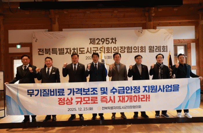 [¹Ìµð¾îÀü³² ÀÓ¼º¿Ï ±âÀÚ]12¿ù 23ÀÏ, ¹«ÁÖ Å±ǵµ¿ø¿¡¼ ¿¸° Á¦295Â÷ ÀüºÏƯº°ÀÚÄ¡µµ ½Ã±ºÀÇȸÀÇÀåÇùÀÇȸ(ȸÀå ³²°ü¿ì ÀüÁÖ½ÃÀÇȸ ÀÇÀå) ¿ù·Êȸ¿¡¼ ¼øÃ¢±ºÀÇȸ ¼ÕÁ¾¼® ÀÇÀåÀÌ °ÇÀÇÇÑ '¹«±âÁúºñ·á °¡°Ýº¸Á¶ ¹× ¼ö±Þ¾ÈÁ¤ Áö¿ø»ç¾÷ÀÇ Àç°³¡¦