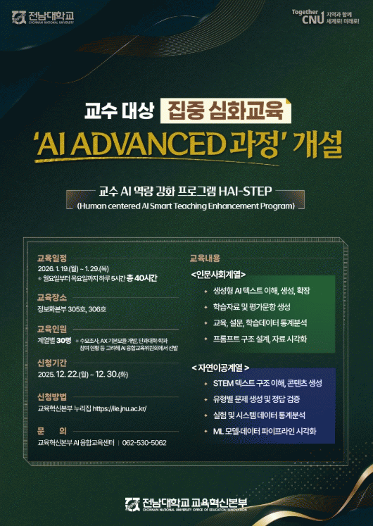 [¹Ìµð¾îÀü³² Á¦°¥´ëÁ¾ ±âÀÚ]Àü±¹ ´ëÇÐ ÃÖÃÊ·Î AI Ä·ÆÛ½º ´ëÀüȯÀ» ÃßÁøÇÑ Àü³²´ëÇб³°¡ ±³¼öµéÀÇ AI Ȱ¿ë ¿ª·®À» ü°èÀûÀ¸·Î °ÈÇϱâ À§ÇÑ ´Ü°èº° ±³À° ÇÁ·Î±×·¥À» º»°Ý ¿î¿µÇÑ´Ù. 24ÀÏ Àü³²´ëÇб³¿¡ µû¸£¸é, Àü³²´ëÇб³ ±³À°Çõ½Åº»ºÎ´Â¡¦