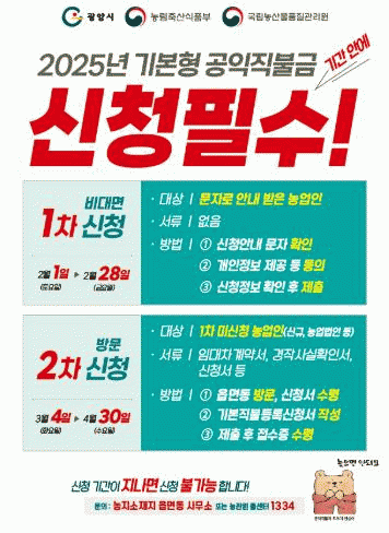 [¹Ìµð¾îÀü³² ÀÓ¼º¿Ï ±âÀÚ]±¤¾ç½Ã´Â 2¿ù 1ÀϺÎÅÍ 4¿ù 30ÀϱîÁö 2025³â ±âº»Çü °øÀÍÁ÷ºÒÁ¦ Á¢¼ö¸¦ ÁøÇàÇÑ´Ù°í 4ÀÏ ¹àÇû´Ù. ±âº»Çü °øÀÍÁ÷ºÒÁ¦´Â ³ó¾÷¡¤³óÃÌÀÇ °øÀͱâ´ÉÀ» °ÈÇÏ°í ³ó¾÷ÀÎÀÇ ¼Òµæ¾ÈÁ¤À» µµ¸ðÇϱâ À§ÇÑ Á¦µµ·Î, ÀÚ°Ý¿ä°ÇÀ» ¡¦
