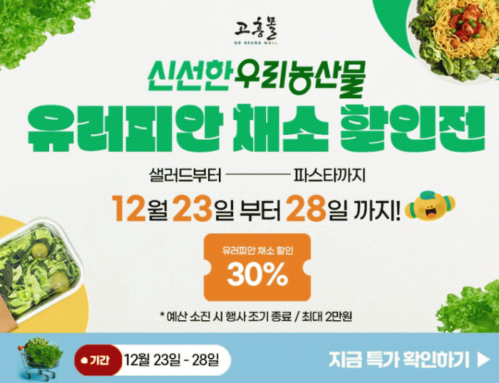 [¹Ìµð¾îÀü³² Á¦°¥´ëÁ¾ ±âÀÚ]°íÈﱺÀÌ ¿î¿µÇÏ´Â ¿Â¶óÀÎ ³ó¼öÃàÆ¯»ê¹° ¼îÇθô ¡®°íÈï¸ô¡¯ÀÌ ¿¬¸»À» ¸Â¾Æ 12¿ù 23ÀϺÎÅÍ 28ÀϱîÁö ¡®»ø·¯µåºÎÅÍ ÆÄ½ºÅ¸±îÁö, À¯·¯ÇÇ¾È Ã¤¼Ò ÇÒÀÎÀü¡¯À» ÁøÇàÇÑ´Ù. À̹ø ±âȹÀüÀº ¿¬¸» ȨÄȨ´ÙÀÌ´× ¼ö¿ä Áõ¡¦