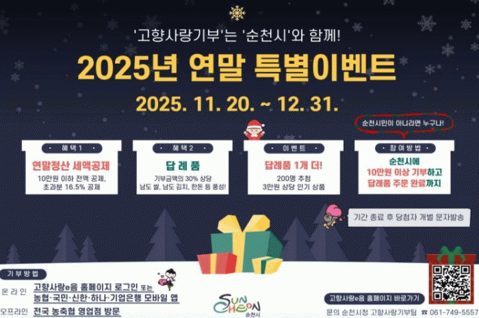 [¹Ìµð¾îÀü³² ÀÓ¼º¿Ï ±âÀÚ]¼øÃµ½Ã°¡ °íÇâ»ç¶û±âºÎÁ¦ Ȱ¼ºÈ¿Í ¿¬¸»Á¤»ê ÇýÅÃÀ» À§ÇØ ½Ç½Ã ÁßÀÎ ¡®°íÇâ»ç¶û±âºÎÁ¦ ¿¬¸» Ưº°À̺¥Æ®¡¯ È«º¸¿¡ ³ª¼¹´Ù. À̺¥Æ®´Â 12¿ù 31ÀϱîÁö °íÇâ»ç¶ûeÀ½ ȨÆäÀÌÁö µîÀ» ÅëÇØ ¼øÃµ½Ã¿¡ 10¸¸¿ø ÀÌ»ó ±âºÎÇÏ¡¦