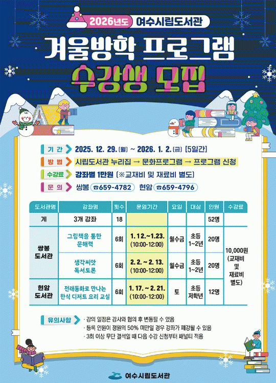 [¹Ìµð¾îÀü³² ÀüÇü¼º ±âÀÚ]¿©¼ö½Ã¸³µµ¼°üÀº ¿À´Â 12¿ù 29ÀϺÎÅÍ 2026³â 1¿ù 2ÀϱîÁö 5Àϰ£ °ü³» ÃʵîÇлýÀ» ´ë»óÀ¸·Î 2026³â °Ü¿ï¹æÇÐ ÇÁ·Î±×·¥ ¼ö°»ý 52¸íÀ» ¼±Âø¼ø ¸ðÁýÇÑ´Ù. ½ÖºÀµµ¼°ü¿¡¼´Â ¡ã±×¸²Ã¥À» ÅëÇÑ ¹®ÇØ·Â ¡ã»ý°¢¾¾¾Ñ µ¶¡¦