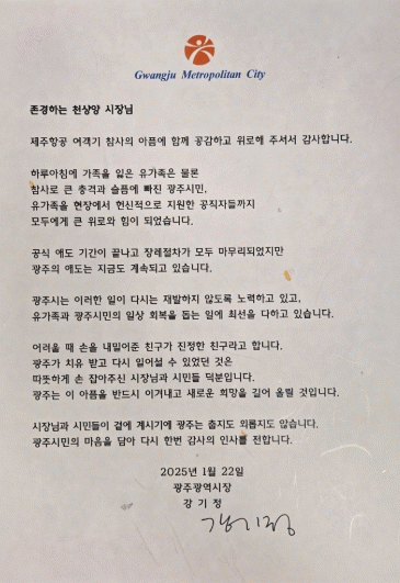 [¹Ìµð¾îÀü³² Á¦°¥´ëÁ¾ ±âÀÚ]±¤ÁÖ±¤¿ª½Ã´Â Á¦ÁÖÇ×°ø ¿©°´±â Âü»ç¿Í °ü·ÃÇØ ¡®¾Öµµ ¼Çѹ®¡¯°ú ±ÙÁ¶ÈȯÀ» º¸³»ÁØ ÇØ¿Ü Àڸš¤¿ìÈ£µµ½Ã, ÁÖÇѿܱ¹°ø°üÀå µî ¼¼°è 50¿© µµ½Ã¡¤±â°ü¿¡ ¡®°¨»ç ¼Çѹ®¡¯À» 22ÀÏ ¹ß¼ÛÇß´Ù. Á¦ÁÖÇ×°ø ¿©°´±â Âü¡¦