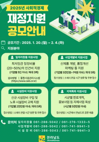[¹Ìµð¾îÀü³² Á¦°¥´ëÁ¾ ±âÀÚ]Àü¶ó³²µµ°¡ 2¿ù 4ÀϱîÁö Áö¿ª »çȸÀû°æÁ¦±â¾÷ÀÇ Áö¼ÓÀûÀÌ°í ¾ÈÁ¤ÀûÀÎ ¼ºÀå°ú ÀÚ¸³ °È¸¦ Áö¿øÇÏ´Â 2025³â »çȸÀû°æÁ¦±â¾÷ ÀçÁ¤Áö¿ø»ç¾÷ °ø¸ð¿¡ ³ª¼±´Ù. °ø¸ð¸¦ ÅëÇØ ÀÏÀÚ¸® âÃâ Áö¿ø, »ç¾÷ °³¹ßºñ Áö¿ø, ½Ã¡¦