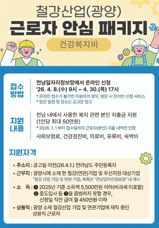 [¹Ìµð¾îÀü³² ÀÓ¼º¿Ï ±âÀÚ] ±¤¾ç½Ã´Â ö°»ê¾÷ °í¿ëÀ§±â¿¡ ´ëÀÀÇϰí ÀçÁ÷ ±Ù·ÎÀÚÀÇ °í¿ë À¯Áö¿Í »ýȰ ¾ÈÁ¤À» Áö¿øÇϱâ À§ÇØ Àü¶ó³²µµ¿Í ÇÔ²² °í¿ë³ëµ¿ºÎ ¡®Ã¶°»ê¾÷ »ó¿ëÁ÷ ±Ù·ÎÀÚ ¾È½ÉÆÐŰÁö(°Ç°º¹Áöºñ)¡¯ »ç¾÷À» ÃßÁøÇÑ´Ù°í ¹àÇû´Ù. Áö¡¦