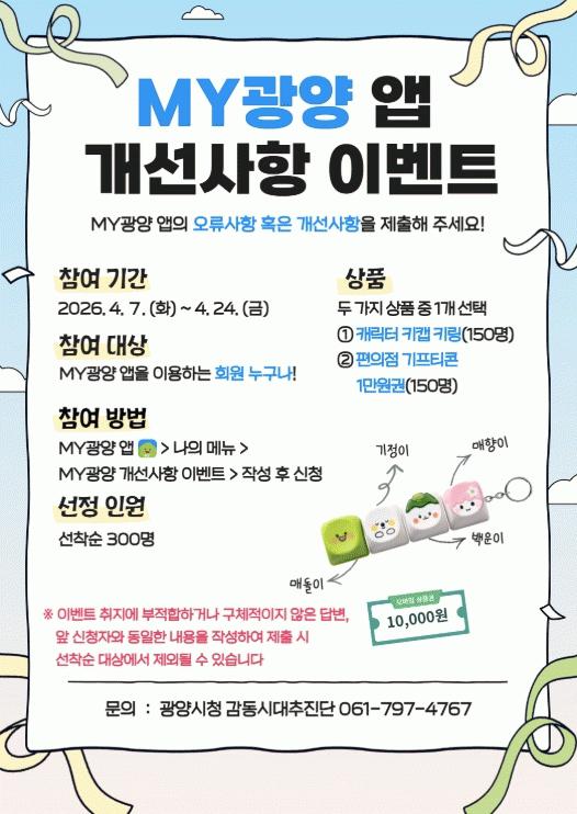 [¹Ìµð¾îÀü³² ÀÓ¼º¿Ï ±âÀÚ] ±¤¾ç½Ã´Â 4¿ù 7ÀϺÎÅÍ 24ÀϱîÁö ¡®MY±¤¾ç ¾Û °³¼±»çÇ× À̺¥Æ®¡¯¸¦ ¿î¿µÇÑ´Ù°í ¹àÇû´Ù. À̹ø À̺¥Æ®´Â ¡®MY±¤¾ç¡¯ ¾Û ÀÌ¿ëÀÚÀÇ ÀǰßÀ» ¼ö·ÅÇØ ½Ã½ºÅÛ ¿À·ù¸¦ °³¼±ÇÏ°í »ç¿ëÀÚ Áß½ÉÀÇ ±â´ÉÀ» °ÈÇϱâ À§ÇØ ¸¶·Ã¡¦