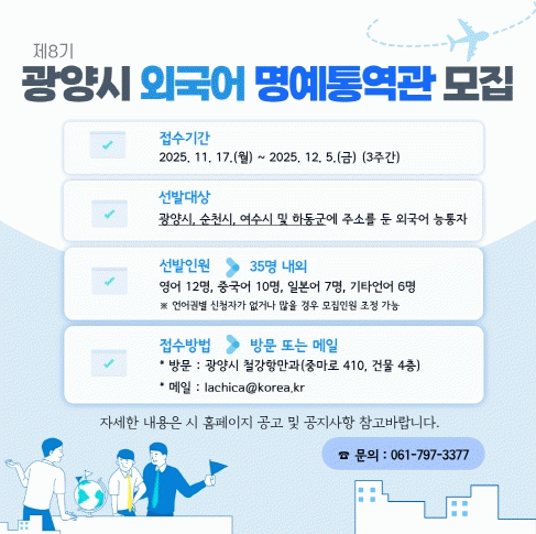 [¹Ìµð¾îÀü³² ÀÓ¼º¿Ï ±âÀÚ]±¤¾ç½Ã°¡ ±¹Á¦±³·ù ÇöÀå¿¡¼ Ȱµ¿ÇÒ ¡®Á¦8±â ¿Ü±¹¾î ¸í¿¹Å뿪°ü¡¯À» ¸ðÁýÇÑ´Ù. ±¤¾ç½Ã ¿Ü±¹¾î ¸í¿¹Å뿪°üÀº ½ÃÀÇ ±¹Á¦È Á¤Ã¥ ÃßÁø°ú °¢Á¾ ±¹Á¦±³·ù Ȱµ¿À» Áö¿øÇÏ´Â ¿ªÇÒÀ» ¸Ã´Â´Ù. ÁÖ¿ä Ȱµ¿ ºÐ¾ß´Â ±¹Á¦Çà»ç¡¦