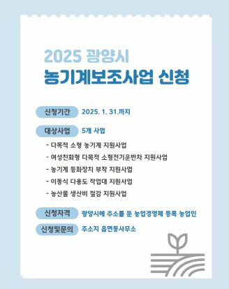 [¹Ìµð¾îÀü³² ÀÓ¼º¿Ï ±âÀÚ]±¤¾ç½Ã°¡ ¿À´Â 31ÀϱîÁö 2025³â ³ó±â°è º¸Á¶»ç¾÷ ½ÅûÀ» ¹Þ´Â´Ù°í 10ÀÏ ¹àÇû´Ù. ¡®³ó±â°è º¸Á¶»ç¾÷¡¯Àº ¿µ³óö Áßø ³ëµ¿À¸·Î ÀÎÇÑ ¿¾ÇÇÑ ³óÀÛ¾÷ ȯ°æÀ» °³¼±Çϰí, ³ó¾÷ÀÎÀÇ »ý»ê¼º Çâ»ó¿¡ ±â¿©Çϱâ À§ÇÑ »ç¾÷¡¦