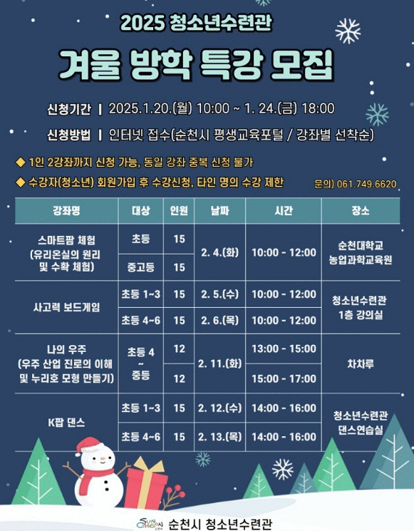 [¹Ìµð¾îÀü³² ÀÓ¼º¿Ï ±âÀÚ]¼øÃµ½Ãû¼Ò³â¼ö·Ã°üÀº °Ü¿ï¹æÇÐÀ» ¸Â¾Æ û¼Ò³âµé¿¡°Ô ´Ù¾çÇÑ ¹è¿ò°ú °æÇèÀÇ ±âȸ¸¦ Á¦°øÇϴ Ưº° ÇÁ·Î±×·¥À» ¿î¿µÇÑ´Ù°í ¹àÇû´Ù. À̹ø Ư°Àº ¼øÃµ½Ã°¡ ¹Ì·¡ Çõ½Å »ê¾÷À¸·Î ÁÖ¸ñÇϰí ÀÖ´Â ½º¸¶Æ®ÆÊ°ú ¿ìÁÖ°ü·Ã¡¦