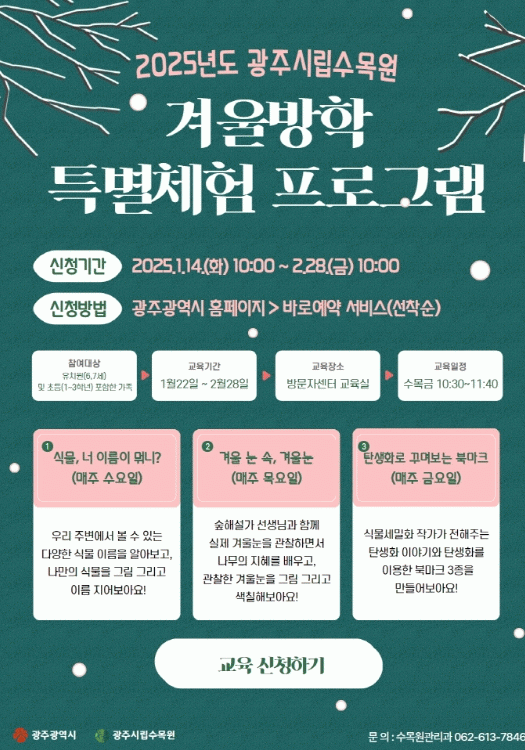 [¹Ìµð¾îÀü³² Á¦°¥´ëÁ¾ ±âÀÚ]±¤ÁÖ±¤¿ª½Ã¸³¼ö¸ñ¿øÀº °Ü¿ï¹æÇÐÀ» ¸Â¾Æ ¿À´Â 1¿ù22ÀϺÎÅÍ 2¿ù28ÀϱîÁö Áö¿ª ¾î¸°À̵éÀ» À§ÇÑ ´Ù¾çÇÑ Ã¼ÇèÇÁ·Î±×·¥À» ¿î¿µÇÑ´Ù. üÇèÇÁ·Î±×·¥Àº ÃÑ 3°³·Î, À¯Ä¡¿ø»ý(6¡¤7¼¼)°ú ÃʵîÇлý(1 ºÎÅÍ 3Çгâ)À» Æ÷ÇÔÇÑ¡¦