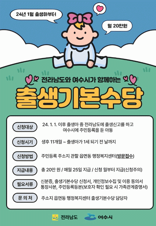 [¹Ìµð¾îÀü³² ÀüÇü¼º ±âÀÚ]¿©¼ö½Ã°¡ ÀúÃâ»ý À§±â ±Øº¹À» À§ÇØ ¼Òµæ ¼öÁذú °ü°è¾øÀÌ ¿ù 20¸¸ ¿øÀÇ Ãâ»ý±âº»¼ö´çÀ» Áö±ÞÇÑ´Ù. Áö±Þ ´ë»óÀº 2024³â 1¿ù 1ÀÏ ÀÌÈÄ Ãâ»ý¾Æ Áß Àü¶ó³²µµ¿¡ Ãâ»ý½Å°í¸¦ Çϰí, Ãâ»ý¾Æ¿Í º¸È£ÀÚ Áß 1¸íÀÌ ¿©¼ö½Ã¿¡¡¦