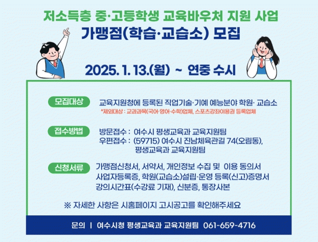 [¹Ìµð¾îÀü³² ÀüÇü¼º ±âÀÚ]¿©¼ö½Ã°¡ 2025³â Àú¼ÒµæÃþ Áß¡¤°íµîÇлý ±³À°¹Ù¿ìó Áö¿ø »ç¾÷¿¡ Âü¿©ÇÒ °¡¸ÍÁ¡À» ÀÌ´Þ 13ÀϺÎÅÍ ¿¬Áß ¼ö½Ã ¸ðÁýÇÑ´Ù. ÇØ´ç »ç¾÷Àº °ü³» Àú¼ÒµæÃþ(±âÁØÁßÀ§¼Òµæ 50%) °¡Á¤ÀÇ Áß¡¤°íµîÇлý¿¡°Ô ´Ù¾çÇÑ ¹è¿òÀÇ ±â¡¦