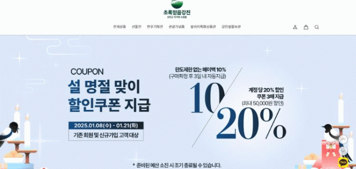 [¹Ìµð¾îÀü³² °í±Ô¼® ±âÀÚ]°Áø±ºÀº Áö¿ª´ëÇ¥ ³ó¼öƯ»ê¹° ¿Â¶óÀÎ ÆÇ¸ÅóÀÎ ¡®ÃʷϹÏÀ½°Áø(greengj.com)¡¯ ¼îÇθô¿¡¼ 2025³â ¼³ ¸íÀýÀ» ¸Â¾Æ °í°´ À¯ÀÔ°ú ±¸¸Å Ȱ¼ºÈ¸¦ À§ÇÑ ´ë±Ô¸ð Çà»ç¸¦ ÃßÁøÇÑ´Ù. À̹ø Çà»ç´Â 1¿ù 21ÀϱîÁö ÁøÇàµÇ¡¦