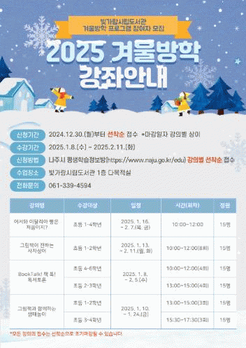 [¹Ìµð¾îÀü³² Á¦°¥´ëÁ¾ ±âÀÚ]³ªÁֽúû°¡¶÷½Ã¸³µµ¼°üÀÌ °Ü¿ï¹æÇÐÀ» ¸Â¾Æ Ưº°ÇÑ µ¶¼¹®È ÇÁ·Î±×·¥À» ¼±º¸ÀδÙ. Àü¶ó³²µµ ³ªÁֽô 1¿ù 8ÀϺÎÅÍ 2¿ù 11ÀϱîÁö ¡®2025³â °Ü¿ï¹æÇÐ ÇÁ·Î±×·¥¡¯¿¡¼ 4°³ °Á¸¦ ¿î¿µÇÑ´Ù°í 6ÀÏ ¹àÇû´Ù. À̹ø¡¦