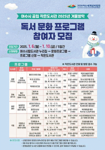 [¹Ìµð¾îÀü³² ÀüÇü¼º ±âÀÚ]¿©¼ö½Ã°¡ °ø¸³ ÀÛÀºµµ¼°ü ¡®°Ü¿ï¹æÇÐ µ¶¼¹®È ÇÁ·Î±×·¥¡¯¿¡ Âü¿©ÇÒ 6~7¼¼ À¯¾Æ ¹× ÃÊ¡¤ÁßÇлýÀ» ¿À´Â 6ÀϺÎÅÍ 10ÀϱîÁö 5Àϰ£ ¸ðÁýÇÑ´Ù. ÇÁ·Î±×·¥ ¿î¿µ ±â°üÀº ¡®²ÞÀ»Å°¿ì´Â(¹ÌÆò¼±°æ3Â÷)¡¯, ¡®Ã»¼Ö±Û´©¸®(µ¹¡¦