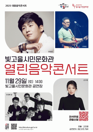 [¹Ìµð¾îÀü³² Á¦°¥´ëÁ¾ ±âÀÚ]±¤ÁÖ¹®ÈÀç´ÜÀº ¿À´Â 11¿ù 29ÀÏ ºû°íÀ»½Ã¹Î¹®È°ü °ø¿¬Àå¿¡¼ ¡®2025 ´ëÁßÀ½¾ÇÄܼƮ(2ȸÂ÷)¡¯¸¦ Àü¼® ¹«·á·Î °³ÃÖÇÑ´Ù°í ¹àÇû´Ù. À̹ø °ø¿¬Àº ½Ã¹Î ¹®Èº¹Áö ½ÇÇö°ú ¹®È Á¢±Ù¼º È®´ë¸¦ À§ÇÑ ¿¸° À½¾Çȸ·Î, ¡¦