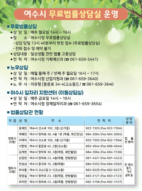 [¹Ìµð¾îÀü³² ÀüÇü¼º ±âÀÚ]¿©¼ö½Ã°¡ ÀÏ»ó»ýȰ¿¡¼ ¹ý·ü¹®Á¦·Î ¾î·Á¿òÀ» °Þ°Å³ª ÇÇÇØ¸¦ º» ½Ã¹ÎÀ» À§ÇØ ¿¬Áß ¹«·á¹ý·ü»ó´ã½ÇÀ» ¿î¿µÇϰí ÀÖ´Ù. »ó´ã ¹üÀ§´Â ºÎµ¿»ê, »ó¼Ó, ä±Ç¡¤Ã¤¹«, ÀÌÈ¥ µî ¹Î»ç¡¤Çü»ç¡¤°¡»ç¡¤ÇàÁ¤»ç°Ç ¹× ¿©¼ö½Ã ÇàÁ¤¡¦