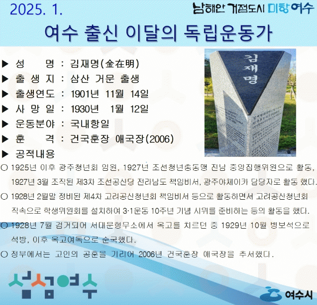 [¹Ìµð¾îÀü³² ÀüÇü¼º ±âÀÚ]¿©¼ö½Ã°¡ 2025³â 1¿ùÀÇ µ¶¸³¿îµ¿°¡·Î »ï»ê °Å¹® Å»ýÀÇ ¡®±èÀç¸í(ÑÑî¤Ù¥) ¼±»ý¡¯À» ¼±Á¤Çß´Ù. ±èÀç¸í ¼±»ýÀº 1901³â 11¿ù¿¡ ž 1925³â ÀÌÈÄ ±¤ÁÖû³âȸ ÀÓ¿ø°ú 1927³â Á¶¼±Ã»³âÃѵ¿¸Í Àü³² Áß¾ÓÁýÇàÀ§¿øÀ» ¡¦