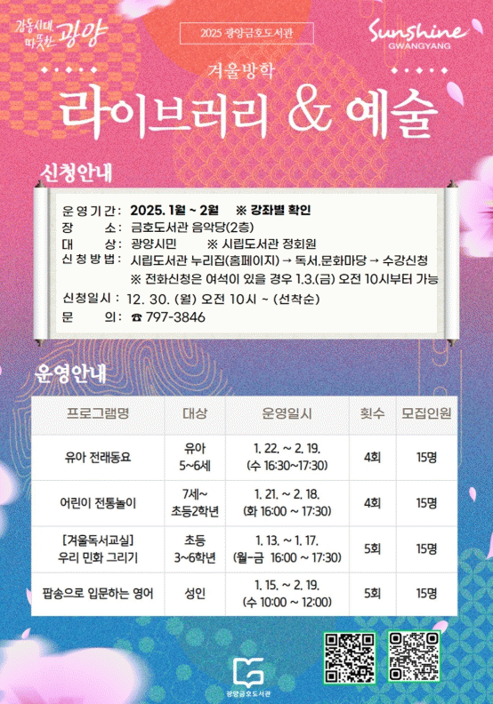 [¹Ìµð¾îÀü³² ÀÓ¼º¿Ï ±âÀÚ]±¤¾ç±ÝÈ£µµ¼°üÀÌ 2025³âÀ» ¸Â¾Æ °ü³» ¾î¸°ÀÌ, ¼ºÀεéÀ» ´ë»óÀ¸·Î °Ü¿ï¹æÇÐ ÇÁ·Î±×·¥ '¶óÀ̺귯¸®¡¤¿¹¼ú'¼ö°»ýÀ» ¸ðÁýÇÑ´Ù. ±ÝÈ£µµ¼°üÀº ¿¹¼ú ÁÖÁ¦ Æ¯È µµ¼°üÀ¸·Î Ã¥À» ¸Å°³·Î ÇÑ ´Ù¾çÇÑ ÁÖÁ¦¿Í »õ·Î¿î ½Ãµµ¡¦