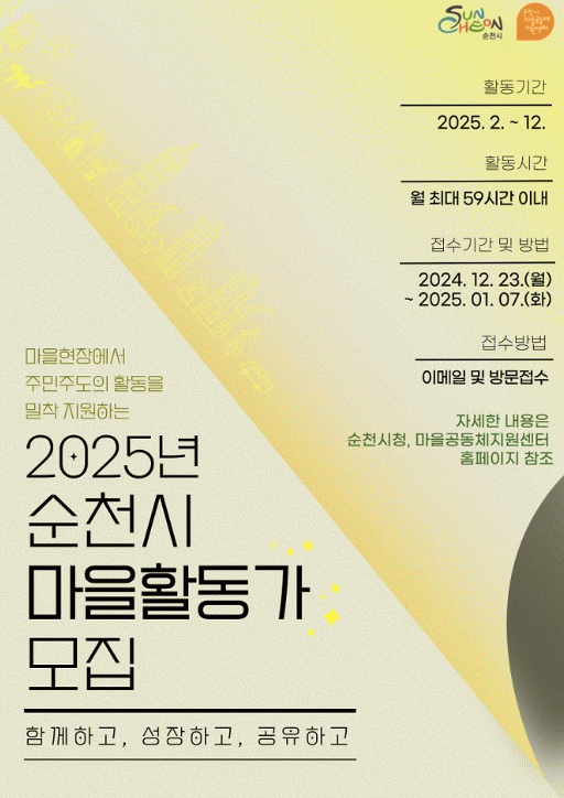 [¹Ìµð¾îÀü³² ÀÓ¼º¿Ï ±âÀÚ]¼øÃµ½Ã´Â ¸¶À»°øµ¿Ã¼ ¹× ÁÖ¹ÎÀÚÄ¡ Ȱµ¿À» ÃËÁø¡¤¹ß±¼ÇÏ°í ¸¶À» ÇöÀå¿¡¼ ÁÖ¹ÎÁÖµµÀÇ È°µ¿À» ¹ÐÂø Áö¿øÇÒ ¼øÃµ½Ã ¸¶À»È°µ¿°¡ 6¸íÀ» ¸ðÁýÇÑ´Ù°í ¹àÇû´Ù. ¸¶À»È°µ¿°¡´Â À§ÃËÀϷκÎÅÍ 2025³â 12¿ù±îÁö Ȱµ¿Çϸç, ÁÖ¡¦