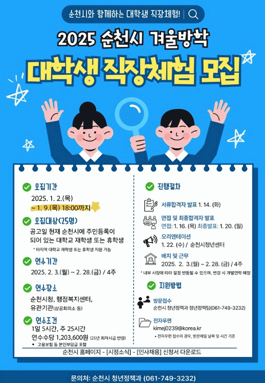 [¹Ìµð¾îÀü³² ÀÓ¼º¿Ï ±âÀÚ]¼øÃµ½Ã´Â ¿À´Â 1¿ù 2ÀϺÎÅÍ 1¿ù 9ÀϱîÁö 8Àϰ£ 2025³â °Ü¿ï¹æÇÐ ´ëÇлý Á÷ÀåüÇè ¿¬¼ö»ýÀ» ¸ðÁýÇÑ´Ù°í ¹àÇû´Ù. ¼±¹ßÀοøÀº ÃÑ 25¸íÀ¸·Î, ´ë»óÀº 1¿ù 2ÀÏ ±âÁØ ¼øÃµ½Ã¿¡ Áֹεî·ÏÀÌ µÇ¾î ÀÖ´Â ´ëÇб³ ÀçÇлý ¹× ¡¦