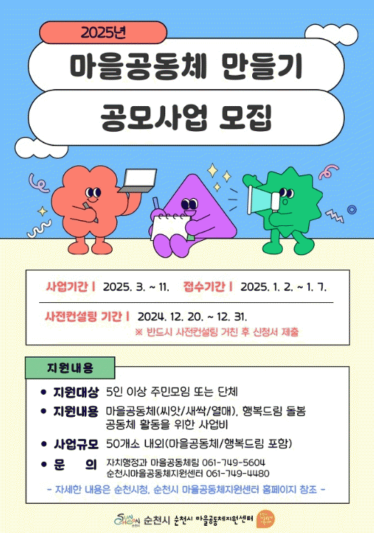 [¹Ìµð¾îÀü³² ÀÓ¼º¿Ï ±âÀÚ]¼øÃµ½Ã´Â 2025³â ¸¶À»°øµ¿Ã¼ ¸¸µé±â °ø¸ð»ç¾÷¿¡ Âü¿©ÇÒ °øµ¿Ã¼¸¦ ³»³â 1¿ù 7ÀϱîÁö ¸ðÁýÇÑ´Ù. ¸ðÁýºÐ¾ß´Â ÁÖ¹ÎÁÖµµ ¸¶À»°øµ¿Ã¼ Ȱ¼ºÈ¸¦ À§ÇØ °ø¸ð»ç¾÷¿¡ Âü¿©ÇÒ ¡®Çູµå¸² µ¹º½°øµ¿Ã¼¡¯¿Í ¡®¸¶À»°øµ¿Ã¼ Ȱµ¿Áö¡¦