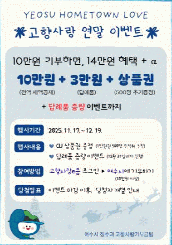 [¹Ìµð¾îÀü³² ÀüÇü¼º ±âÀÚ]¿©¼ö½Ã´Â ¿¬¸»Á¤»ê ½ÃÁðÀ» ¸Â¾Æ °íÇâ»ç¶û±âºÎ Âü¿©ÀÚ¿¡°Ô ´õ ¸¹Àº ÇýÅÃÀ» Á¦°øÇϱâ À§ÇØ ¡®°íÇâ»ç¶û±âºÎÁ¦ ¿¬¸» À̺¥Æ®¡¯¸¦ ÁøÇàÇÑ´Ù. À̹ø À̺¥Æ®´Â 12¿ù 19ÀϱîÁö °íÇâ»ç¶ûeÀ½ ´©¸®Áý ¶Ç´Â ÀºÇà ¾ÛÀ» ÅëÇØ 10¡¦