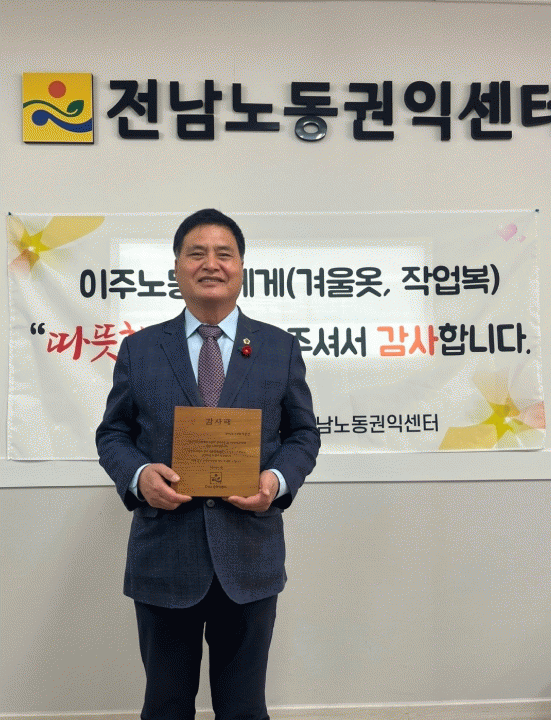 [¹Ìµð¾îÀü³² Á¦°¥´ëÁ¾ ±âÀÚ]Àü¶ó³²µµÀÇȸ ÁÖÁ¾¼· ÀÇ¿ø(´õºÒ¾î¹ÎÁÖ´ç, ¿©¼ö6)Àº 26ÀÏ Àü³²³ëµ¿±ÇÀͼ¾ÅÍ(¼¾ÅÍÀå ¹®±æÁÖ)·ÎºÎÅÍ Ãë¾à°èÃþ ³ëµ¿ÀÚ ±Ç¸®º¸Àå ¹× Áö¿ø¿¡ ±â¿©ÇÑ °ø·Î·Î °¨»çÆÐ¸¦ ¹Þ¾Ò´Ù. Àü³²³ëµ¿±ÇÀͼ¾ÅÍ´Â ³ëµ¿ÇöÀå¿¡¼ ¹ß»ý¡¦
