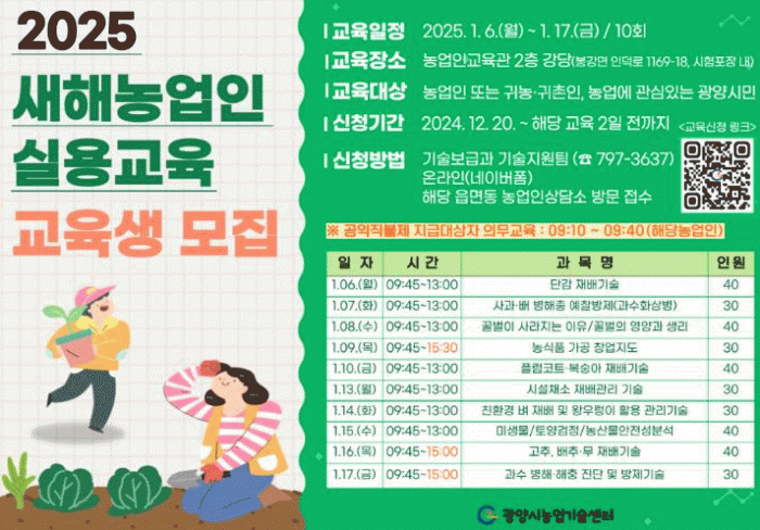 [¹Ìµð¾îÀü³² ÀÓ¼º¿Ï ±âÀÚ]±¤¾ç½Ã´Â 2025³â »õÇØ³ó¾÷ÀÎ ½Ç¿ë±³À° ±³À°»ýÀ» ¸ðÁýÇÑ´Ù°í 23ÀÏ ¹àÇû´Ù. ¡®»õÇØ³ó¾÷ÀÎ ½Ç¿ë±³À°¡¯Àº ±âÈÄ ¹× ³ó¾÷ȯ°æ º¯È¿¡ µû¸¥ ³ó¾÷Á¤Ã¥ ¿¬°è ±³À°ÀÌ´Ù. ½Ã´Â ³ó¾÷ÀÎÀÇ ¿µ³ó°èȹ ¼ö¸³À» µ½°í, ÀÛ¹° Àç¹è¡¦