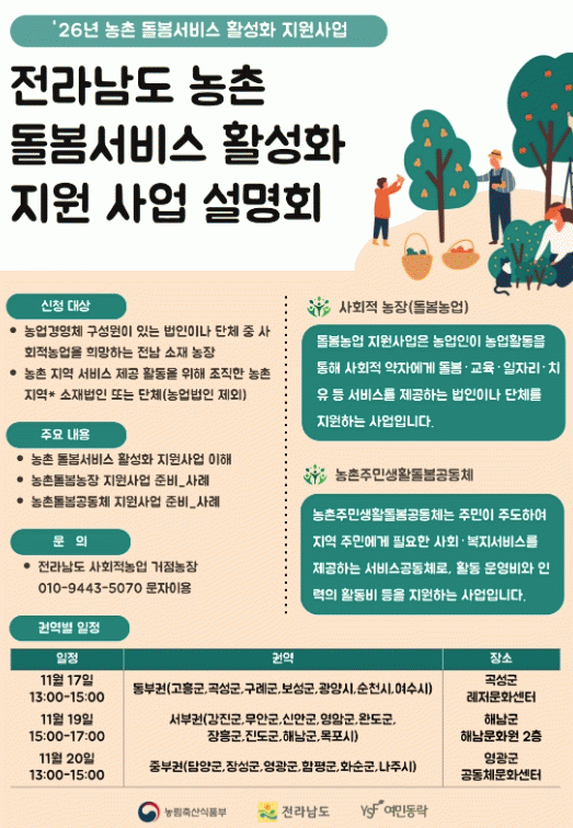 [¹Ìµð¾îÀü³² Á¦°¥´ëÁ¾ ±âÀÚ]Àü³² »çȸÀû³ó¾÷ ±¤¿ª°ÅÁ¡ ¿©¹Îµ¿¶ôÀº 11¿ù 20ÀÏ ¿µ±¤±º ¹¦·®¸é °øµ¿Ã¼ ¼¾ÅÍ¿¡¼ ¡®2026³â Àü¶ó³²µµ ³óÃÌ µ¹º½¼ºñ½º Ȱ¼ºÈ »ç¾÷ ¼³¸íȸ¡¯¸¦ °³ÃÖÇÑ´Ù°í ¹àÇû´Ù. À̹ø ¼³¸íȸ´Â ³ó¾÷¡¤º¹Áö¡¤±³À°¡¤ÀÏÀÚ¸® ±â¡¦
