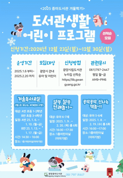 [¹Ìµð¾îÀü³² ÀÓ¼º¿Ï ±âÀÚ]±¤¾çÁ߸¶µµ¼°üÀº °Ü¿ïÇб⸦ ¸Â¾Æ 2025 °Ü¿ïÇб⠵µ¼°ü »ýȰ ¾î¸°ÀÌ ÇÁ·Î±×·¥ ¼ö°»ýÀ» ¸ðÁýÇÑ´Ù°í 12ÀÏ ¹àÇû´Ù. ÇÁ·Î±×·¥ ¿î¿µ ±â°£Àº 2025³â 1¿ù 6ÀϺÎÅÍ 2¿ù 20ÀϱîÁö 6ÁÖÀ̸ç, ¸ðÁý ´ë»óÀº 5¼¼ºÎÅÍ 7¼¼ »ç¡¦