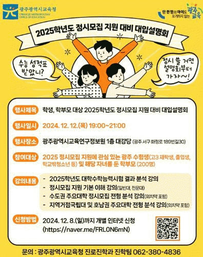 [¹Ìµð¾îÀü³² Á¦°¥´ëÁ¾ ±âÀÚ]±¤Áֽñ³À°Ã»Àº ¿À´Â 12ÀÏ ¿ÀÈÄ 7½Ã ±¤ÁÖ±³À°¿¬±¸Á¤º¸¿ø ´ë°´ç¿¡¼ °í3 ¼öÇè»ý, Á¹¾÷»ý, Çб³¹Ûû¼Ò³â, Çкθð µîÀ» ´ë»óÀ¸·Î ¡®2025Çг⵵ Á¤½Ã¸ðÁý Áö¿ø ´ëºñ Áö¿ø Àü·« ¼³¸íȸ¡¯¸¦ °³ÃÖÇÑ´Ù. À̹ø ¼³¸íȸ¡¦