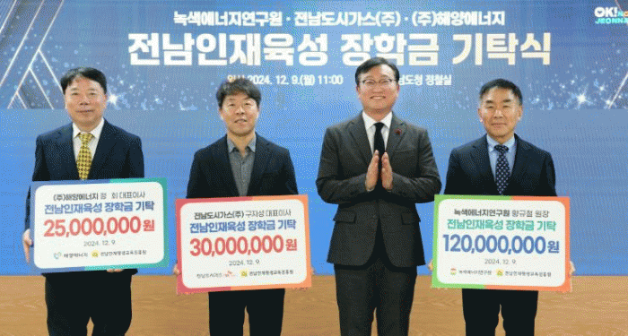 [¹Ìµð¾îÀü³² Á¦°¥´ëÁ¾ ±âÀÚ]Àü¶ó³²µµ´Â 9ÀÏ ÀÎÀç¾ç¼º ÀåÇбÝÀ¸·Î (Àç)³ì»ö¿¡³ÊÁö¿¬±¸¿øÀÌ 1¾ï 2õ¸¸ ¿ø, Àü³²µµ½Ã°¡½º(ÁÖ)°¡ 3õ¸¸ ¿ø, ¢ßÇØ¾ç¿¡³ÊÁö°¡ 2õ500¸¸ ¿øÀ» (Àç)Àü³²ÀÎÀçÆò»ý±³À°ÁøÈï¿ø¿¡ ±âŹÇß´Ù°í ¹àÇû´Ù. À̳¯ Á¤Ã¶½Ç¿¡¼¡¦