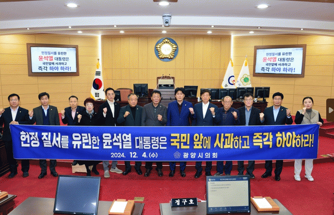 [¹Ìµð¾îÀü³² ÀÓ¼º¿Ï ±âÀÚ]±¤¾ç½ÃÀÇȸ´Â 12¿ù 4ÀÏ Àüü ½ÃÀÇ¿øÀÌ Âü¼®ÇÑ °¡¿îµ¥ º»È¸ÀǸ¦ ¿¾î À±¼®¿ ´ëÅë·É ÇÏ¾ß Ã˱¸ ¼º¸í¼¸¦ ¸¸ÀåÀÏÄ¡·Î äÅÃÇß´Ù. ½ÃÀÇȸ´Â ¼º¸í¼¸¦ ÅëÇØ ´ëÅë·ÉÀÇ ºñ»ó°è¾ö ¼±Æ÷´Â ±¹¹ÎÀÇ ±âº»±Ç°ú ¹ÎÁÖÀû Áú¼¸¦¡¦