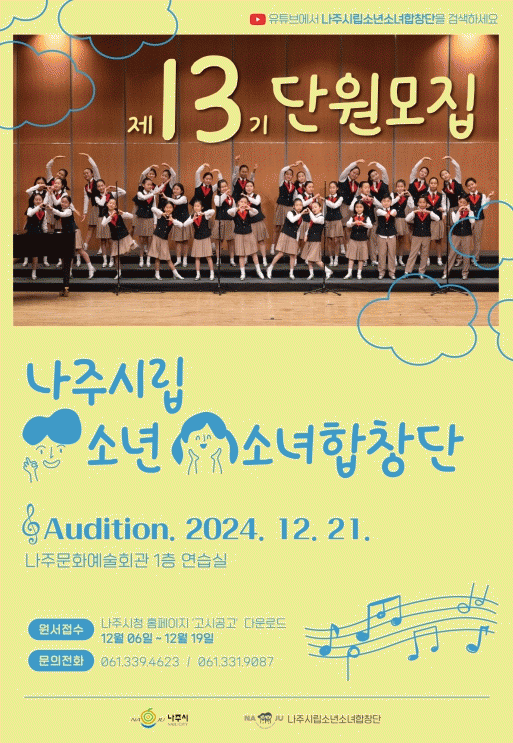 [¹Ìµð¾îÀü³² Á¦°¥´ëÁ¾ ±âÀÚ]Àü¶ó³²µµ ³ªÁֽô ³ªÁֽø³¼Ò³â¼Ò³àÇÕâ´ÜÀÇ Á¦13±â ´Ü¿øÀ» ¸ðÁýÇÑ´Ù°í 2ÀÏ ¹àÇû´Ù. À̹ø ¸ðÁýÀº 12¿ù 6ÀϺÎÅÍ 12¿ù 19ÀϱîÁö ÁøÇàµÇ¸ç ³ªÁÖÀÇ ¾î¸°ÀÌ¿Í Ã»¼Ò³âµéÀÌ À½¾ÇÀû Àç´ÉÀ» ¹ßÈÖÇÏ°í ¿¹¼úÀû ¼ºÀåÀ» µµ¡¦