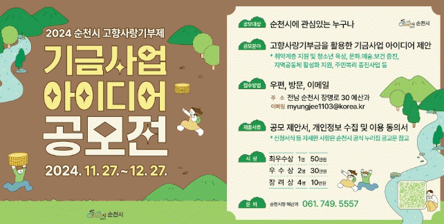 [¹Ìµð¾îÀü³² ÀÓ¼º¿Ï ±âÀÚ]¼øÃµ½Ã°¡ ¿À´Â 12¿ù 27ÀϱîÁö ¡°¼øÃµ½Ã °íÇâ»ç¶û±âºÎÁ¦ ±â±Ý»ç¾÷ ¾ÆÀ̵ð¾î °ø¸ð¡±¸¦ ÁøÇàÇÑ´Ù°í ¹àÇû´Ù. À̹ø °ø¸ð´Â °íÇâ»ç¶û±âºÎÁ¦¸¦ ÅëÇØ ¸ðÀÎ ±âºÎ±ÝÀ» ¼øÃµ½Ã¸¸ÀÇ Æ¯»öÀÖ°í °¡Ä¡ ÀÖ´Â °÷¿¡ »ç¿ëÇϱâ À§ÇØ ¡¦
