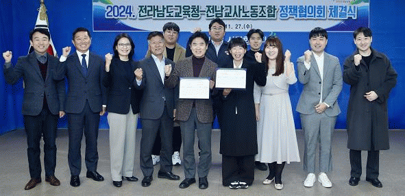 [¹Ìµð¾îÀü³² °í±Ô¼® ±âÀÚ]Àü¶ó³²µµ±³À°Ã»°ú Àü³²±³»ç³ëµ¿Á¶ÇÕÀº 27ÀÏ Àü¶ó³²µµ±³À°Ã» ÁßȸÀǽǿ¡¼ ³ë»ç ¾çÃø °ü°èÀÚµéÀÌ Âü¼®ÇÑ °¡¿îµ¥ ¡®2024³â Á¤Ã¥ÇùÀÇȸ ü°á½Ä¡¯À» °¡Á³´Ù. ³ë¡¤»ç ¾çÃøÀº À̹ø Á¤Ã¥ÇùÀǸ¦ ÅëÇØ ¡ã ±³»ç º»Áú¾÷¹« ¡¦