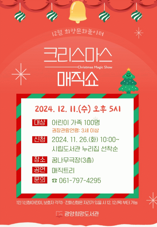 [¹Ìµð¾îÀü³² ÀÓ¼º¿Ï ±âÀÚ]±¤¾ç½Ã´Â 12¿ù 11ÀÏ ¿ÀÈÄ 5½Ã ±¤¾çÈñ¸Áµµ¼°ü ²Þ³ª¹«±ØÀå¿¡¼ ¡®Å©¸®½º¸¶½º ¸ÅÁ÷¼î¡¯ °ø¿¬ÀÌ °³Ãֵȴٰí 27ÀÏ ¹àÇû´Ù. ±¤¾çÈñ¸Áµµ¼°üÀº ¸Å´Þ Áö¿ª ¾î¸°À̵éÀ» ´ë»óÀ¸·Î ¹®È ¿¹¼ú°ø¿¬À» Á¦°øÇÏ´Â Æ¯È ÇÁ·Î±×·¥¡¦