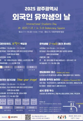 [¹Ìµð¾îÀü³² Á¦°¥´ëÁ¾ ±âÀÚ]±¤ÁÖ±¤¿ª½Ã´Â ¿À´Â 18ÀÏ ¿ÀÈÄ 1½ÃºÎÅÍ 5½Ã±îÁö 5¡¤18¹ÎÁÖ±¤Àå ÀÏ¿ø¿¡¼ ¡®2025 ±¤ÁÖ ¿Ü±¹ÀÎ À¯ÇлýÀÇ ³¯¡¯ Çà»ç¸¦ °³ÃÖÇÑ´Ù. À̹ø Çà»ç´Â ±¤ÁÖ¿¡ °ÅÁÖÇÏ´Â ¿Ü±¹ÀÎ À¯Çлý°ú ±¹³» ´ëÇлý, ½Ã¹ÎÀÌ ÇÔ²² ¾î¿ï¸®¡¦