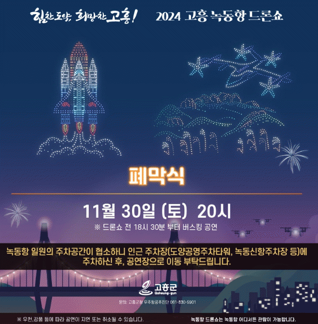 [¹Ìµð¾îÀü³² Á¦°¥´ëÁ¾ ±âÀÚ]°íÈﱺÀº ¿À´Â 30ÀÏ Àú³á 6½Ã 30ºÐ, ³ìµ¿ ¹Ù´ÙÁ¤¿ø¿¡¼ ¡®2024 °íÈï ³ìµ¿Ç× µå·Ð¼î¡¯ Æó¸·½ÄÀ» °³ÃÖÇÑ´Ù°í ¹àÇû´Ù. À̹ø Çà»ç´Â ¹ö½ºÅ· °ø¿¬À» ½ÃÀÛÀ¸·Î °£´ÜÇÑ Æó¸·½ÄÀ» ÁøÇàÇÑ µÚ, 1,500´ë ±Ô¸ðÀÇ µå·Ð¼î¿Í¡¦