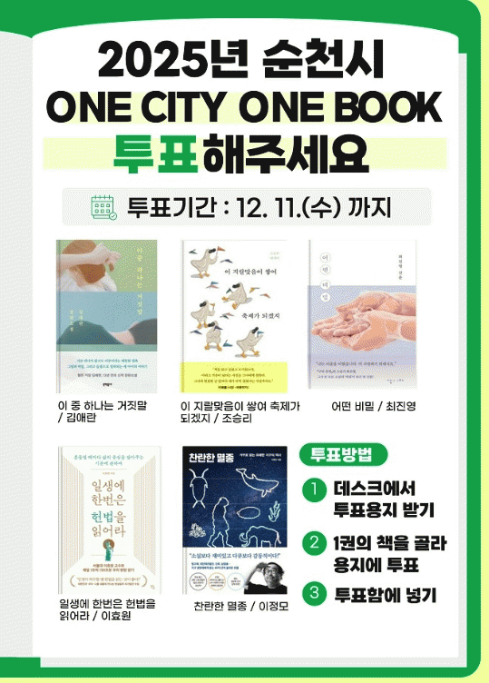 [¹Ìµð¾îÀü³² ÀÓ¼º¿Ï ±âÀÚ]¼øÃµ½Ã°¡ ¿À´Â 12¿ù 11ÀϱîÁö 2025³â ÇÑ ÇØ µ¿¾È ¼øÃµ½Ã¹ÎÀÌ ÇÔ²² ÀÐÀ» ¡®2025³â ¼øÃµ½Ã One City One Book¡¯ ¼±Á¤À» À§ÇÑ ½Ã¹Î ÅõÇ¥¸¦ ÁøÇàÇÑ´Ù°í ¹àÇû´Ù. One City One Book ½Ã¹Î ÅõÇ¥´Â ¿Â¶óÀΰú ¿ÀÇÁ¶óÀÎÀ¸¡¦