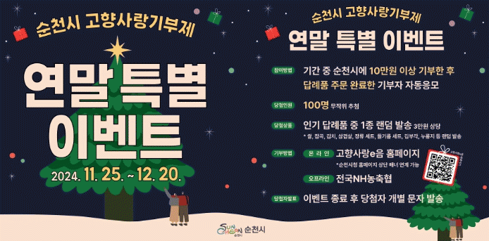 [¹Ìµð¾îÀü³² ÀÓ¼º¿Ï ±âÀÚ]¼øÃµ½Ã´Â ±âºÎ Ȱ¼ºÈ¿Í ¿¬¸»Á¤»êÀ» ´ëºñÇÏ¿© ¿À´Â 25ÀϺÎÅÍ 12¿ù 20ÀϱîÁö ¡°¼øÃµ °íÇâ»ç¶û±âºÎÁ¦ ¿¬¸» Ưº° À̺¥Æ®¡±¸¦ ÁøÇàÇÑ´Ù. À̺¥Æ® ±â°£ µ¿¾È °íÇâ»ç¶ûeÀ½ ´©¸®Áý ¶Ç´Â ³óÇùÀ» ¹æ¹®ÇÏ¿© ¼øÃµ½Ã¿¡ 10¸¸¿ø¡¦