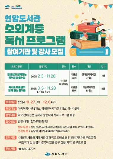 [¹Ìµð¾îÀü³² ÀüÇü¼º ±âÀÚ]¿©¼ö½Ã¸³Çö¾Ïµµ¼°üÀÌ ¿À´Â 27ÀϺÎÅÍ ³»´Þ 6ÀϱîÁö ¡®¼Ò¿Ü°èÃþ µ¶¼ ÇÁ·Î±×·¥¡¯¿¡ Âü¿©ÇÒ ¾Æµ¿¡¤Àå¾ÖÀÎ º¹Áö½Ã¼³ 15°³ ±â°üÀ» °ø°³ ¸ðÁýÇÑ´Ù. º» ÇÁ·Î±×·¥Àº ¡®Àå¾ÖÀΰú ÇÔ²²Çϴ å ´©¸® ¸¶À½ ´©¸®¡¯, ¡®µ¶¼·Î¡¦