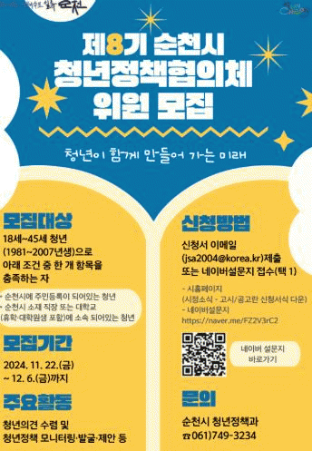 [¹Ìµð¾îÀü³² ÀÓ¼º¿Ï ±âÀÚ]¼øÃµ½Ã´Â 22ÀÏ Ã»³âÀÌ »ì°í ½ÍÀº µµ½Ã¸¦ ¸¸µé±â À§ÇØ Ã»³â Á¤Ã¥ °ü·Ã ¸ð´ÏÅ͸µ, ÀÇÁ¦ ¹ß±¼ ¹× Á¤Ã¥Á¦¾È µî Àû±ØÀûÀ¸·Î Ȱµ¿ÇÒ¡®Á¦8±â ¼øÃµÃ»³âÁ¤Ã¥ÇùÀÇü¡¯À§¿øÀ» ¿À´Â 12¿ù 6ÀϱîÁö ¸ðÁýÇÑ´Ù. ´ë»óÀº 18¼¼ ÀÌ»ó¡¦