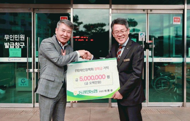 [¹Ìµð¾îÀü³² ÀÓ¼º¿Ï ±âÀÚ]±¤¾ç½Ã´Â Áö³ 20ÀÏ µ¿±¤¾ç³ó¾÷Çùµ¿Á¶ÇÕ(À̵·¼º Á¶ÇÕÀå)ÀÌ (Àç)ÅÂÀÎÀåÇÐȸ¿¡ Áö¿ª ÀÎÀç ¾ç¼ºÀ» À§ÇØ 500¸¸ ¿øÀÇ ÀåÇбÝÀ» ±âŹÇß´Ù°í 21ÀÏ ¾Ë·È´Ù. À̳¯ ±âŹ½Ä¿¡´Â À̵·¼º µ¿±¤¾ç³óÇù Á¶ÇÕÀå, ¹Ú±Ç½Ä µ¿±¤¾ç³ó¡¦